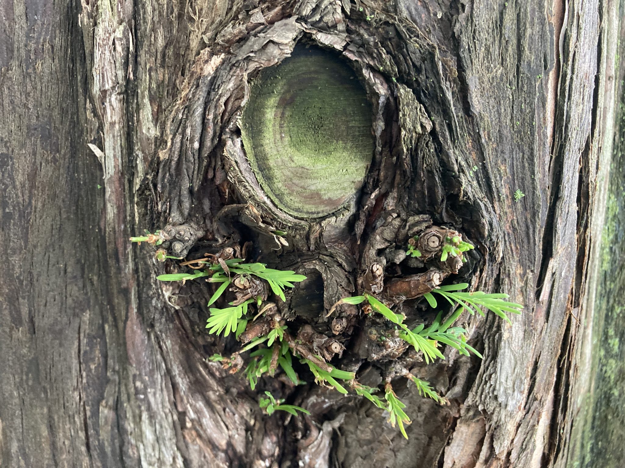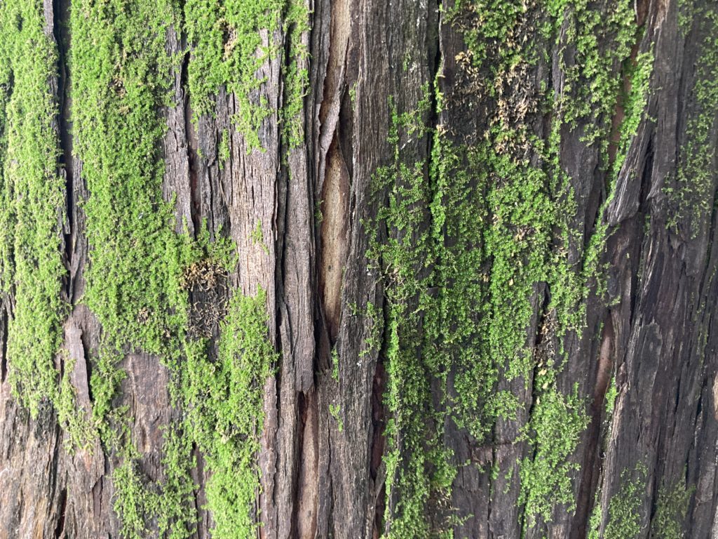 苔の生えた幹肌はカッコイイですね。赤褐色の幹肌で縦に割れ目がたくさんあり、ところどころ剥がれている部分もあります。