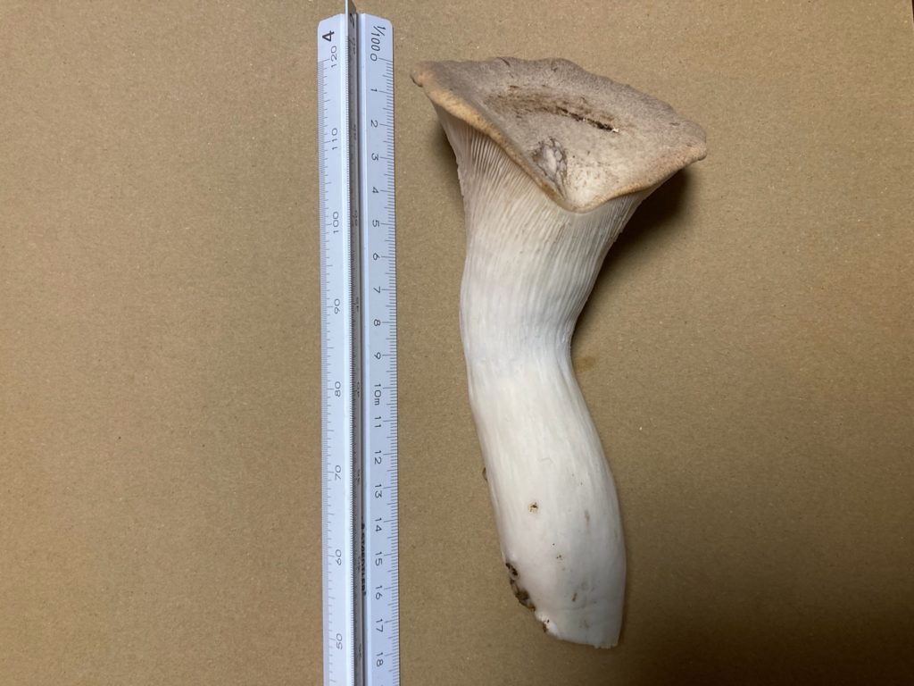 かさが開いて来たら、収穫します。初めての収穫は、約18cmのエリンギを収穫することが出来ました。家の中でこんな大きなエリンが採れるなんて、思いませんでした。