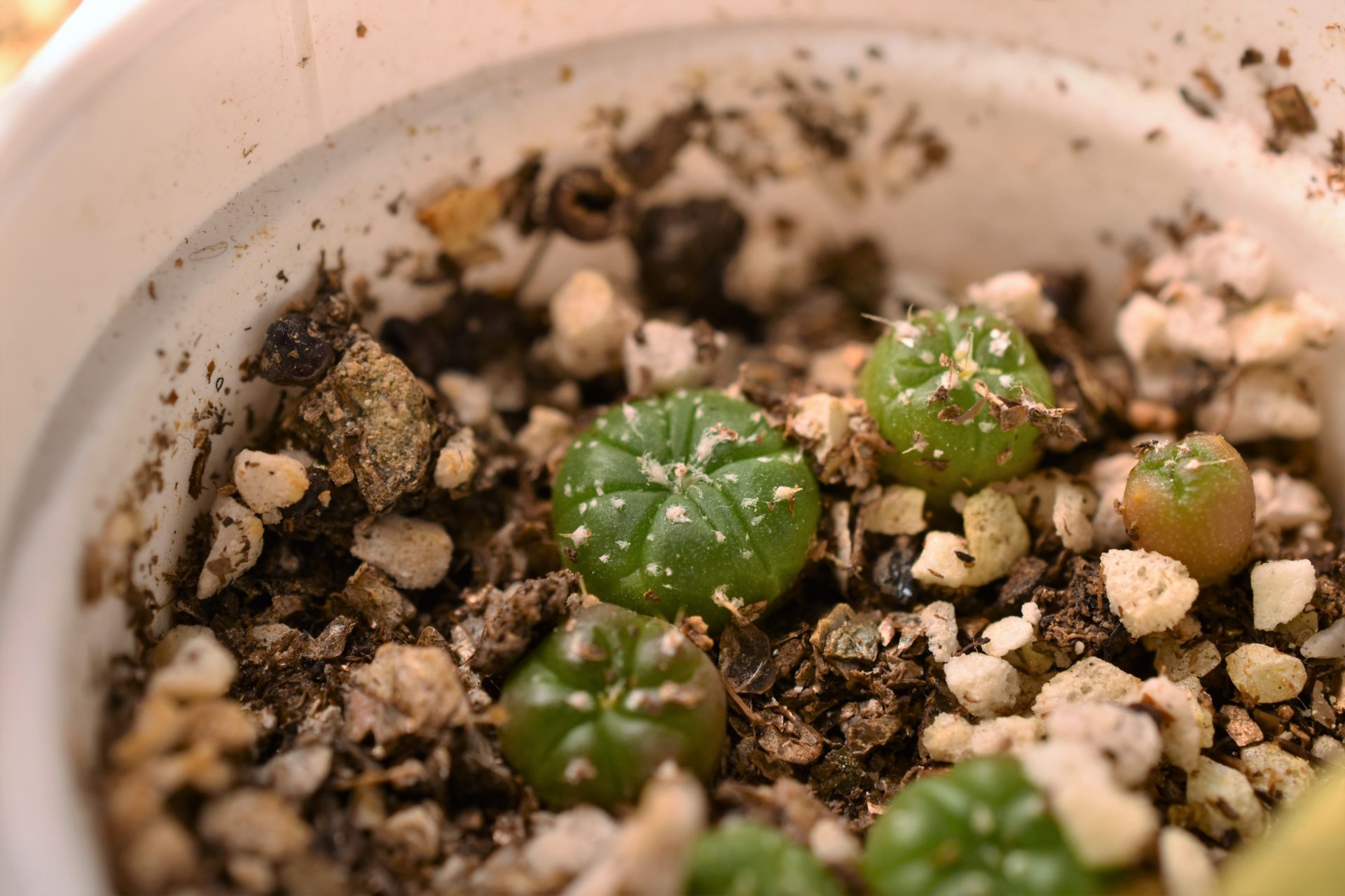 種から育てる「亀甲兜」種から育てるシリーズXFacebookはてブPocketLINEコピー2023.06.042023.08.082022年2月15日播種2023年6月3日播種から約1年半。緑色の丸いフォルムが出てきました。白いフサフサも出ていて可愛いです。2023年8月8日しばらく放置ぎみにしていたら、一体だけ残して、他がお亡くなりになっていました。簡単に発芽してくれた分、生き残るのは、ほんのわずかなのかも知れません。この夏の異常な暑さも加えて、なかなか環境作りが難しいです。この一体を大切に育てたいと思います。